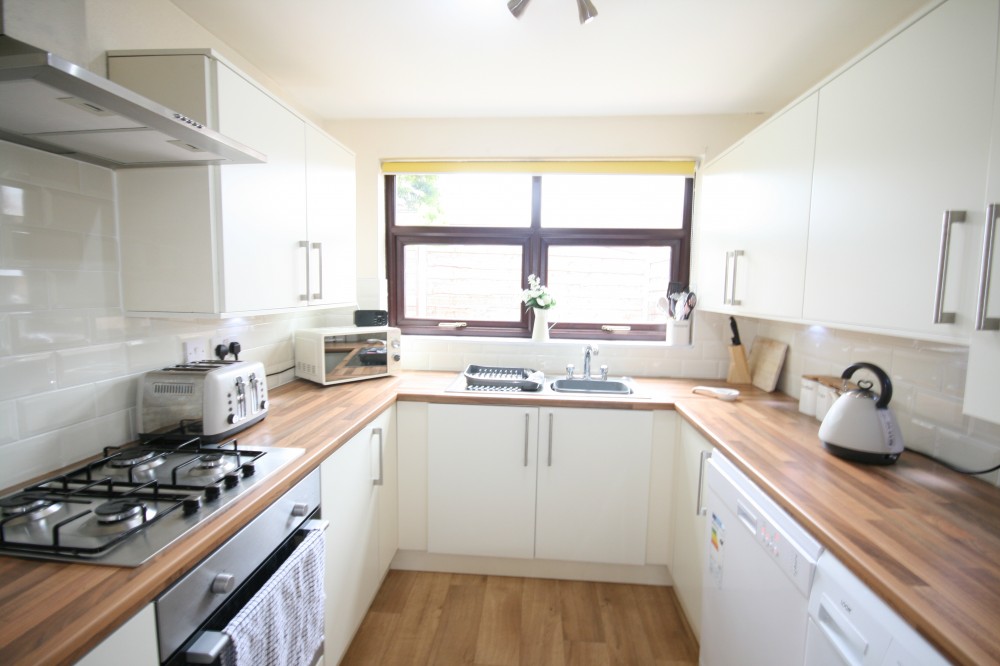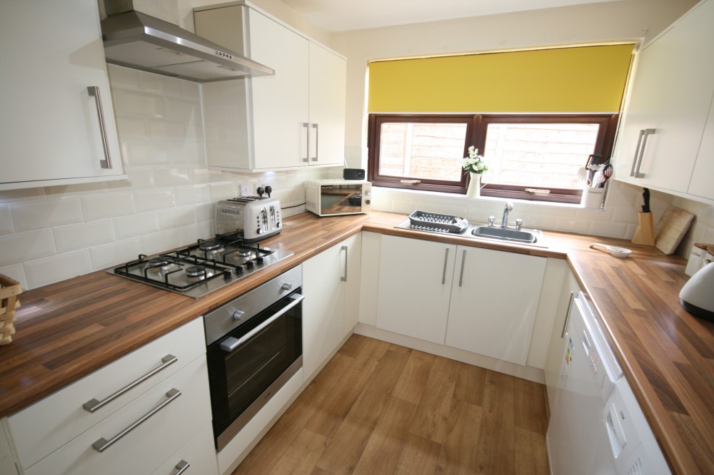 Kitchen - 8'5 x 7'9 (2.57m x 2.36m) - Fully fitted Cream high gloss kitchen comprises of wall & base units, matching work surfaces, stainless steel sink & drainer, integrated oven, hob & extractor fan, tiled splash backs, plumbed for washing machine, tumble dryer & fridge freezer, UPVC double glazed window with a rear aspect view.