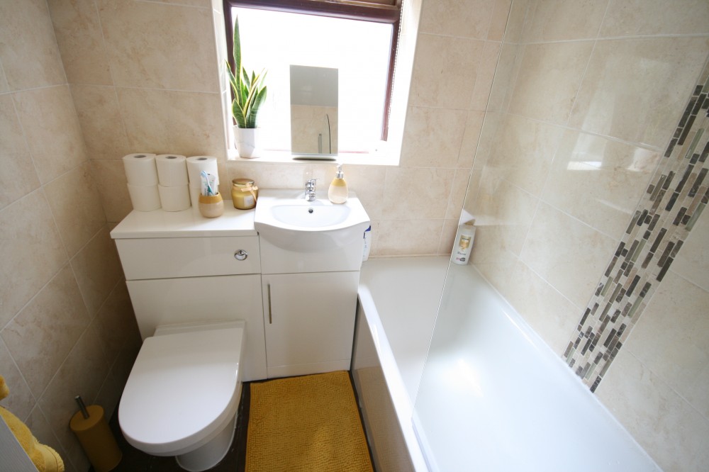 Combined Family Bathroom - 5'6 x 5'7 (1.68m x 1.70m) - Newly fitted family combined bathroom comprises of white bathroom suite, WC with wash basin combination unit, bath with overhead electric shower, fully tiled throughout, wooden flooring & UPVC double glazed window with frosted glass insert.